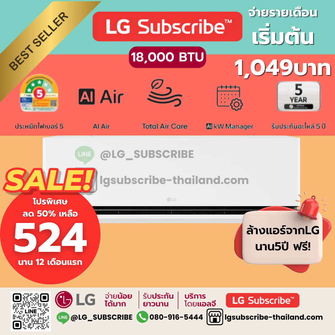 LG Subscribe แอร์อินเวอร์เตอร์ LG DUALCOOL AI Air ขนาด 18000BTU รุ่น SCQ18A
